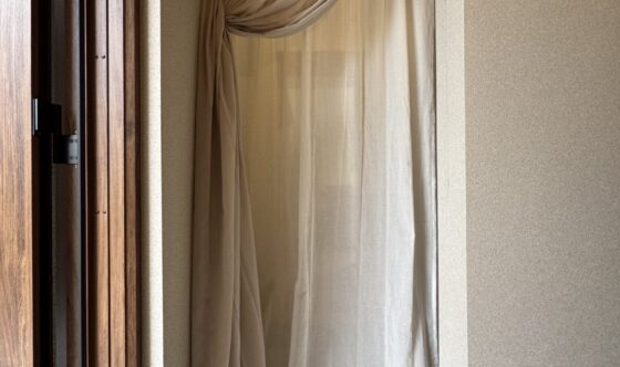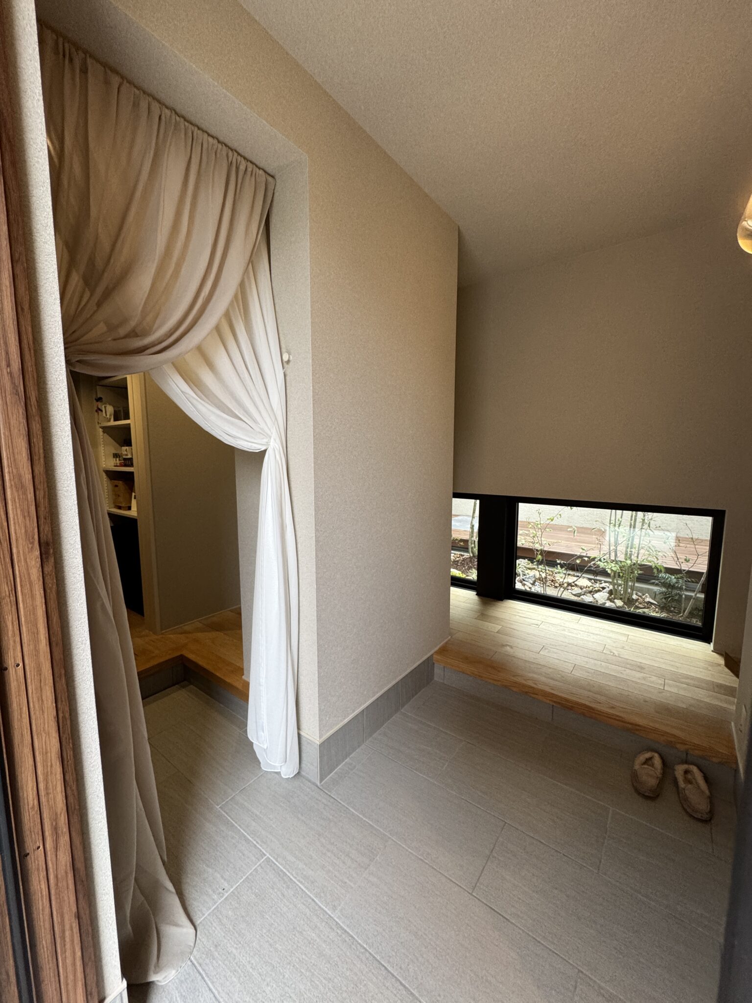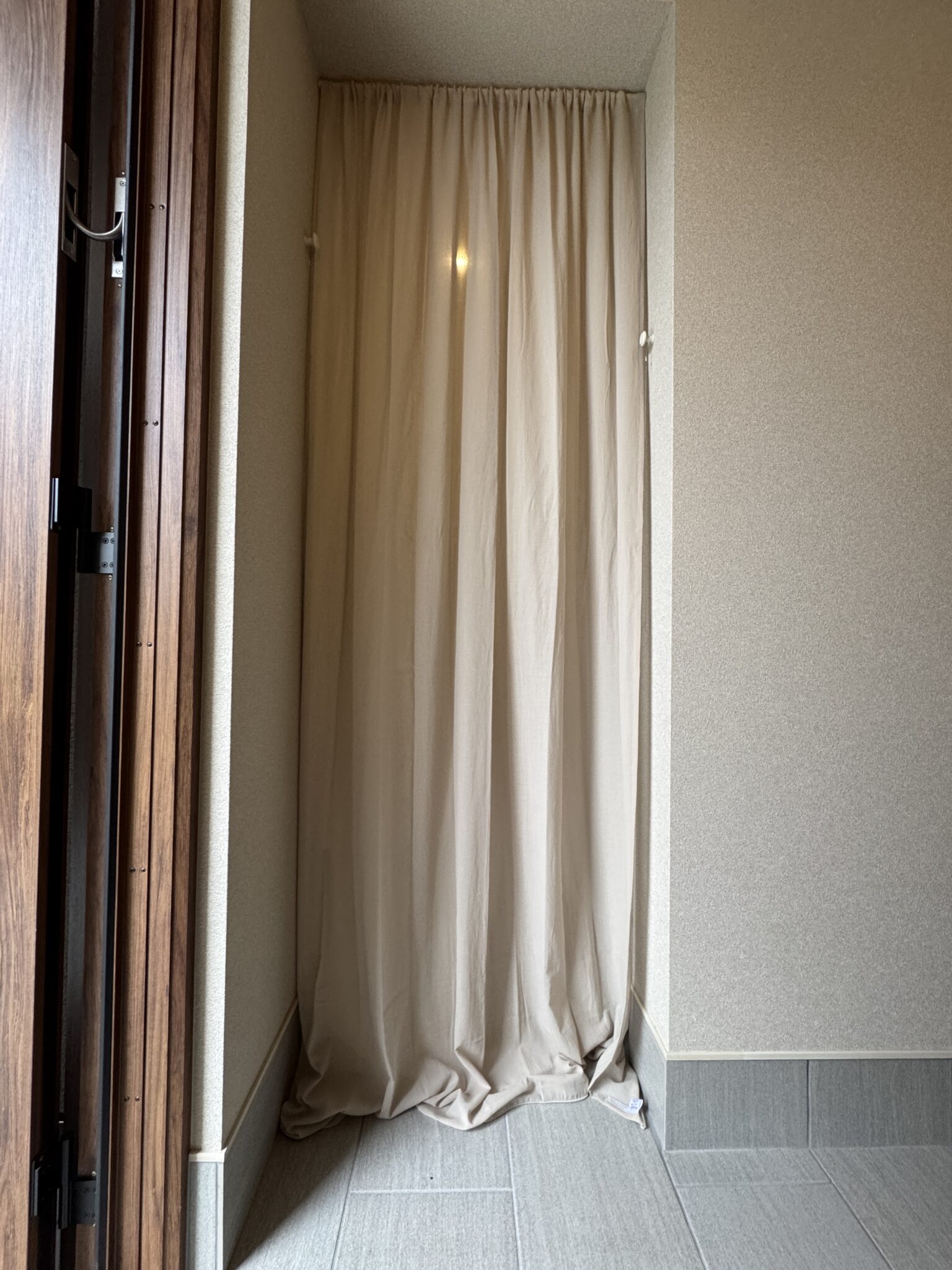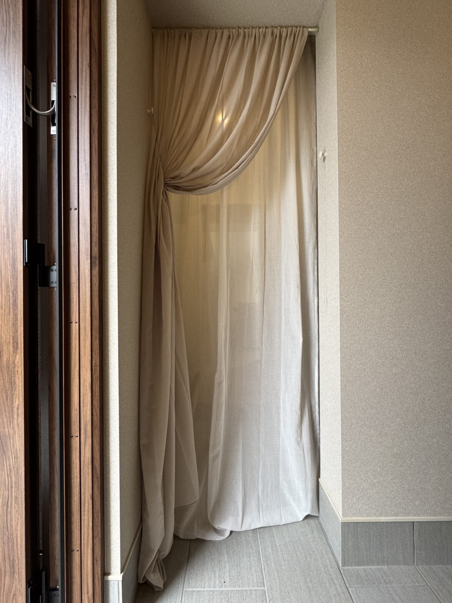 単なる目隠しカーテンの予定が、玄関に入ってまず目に飛び込んでくる、