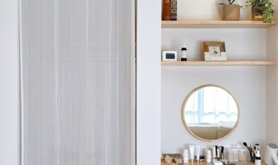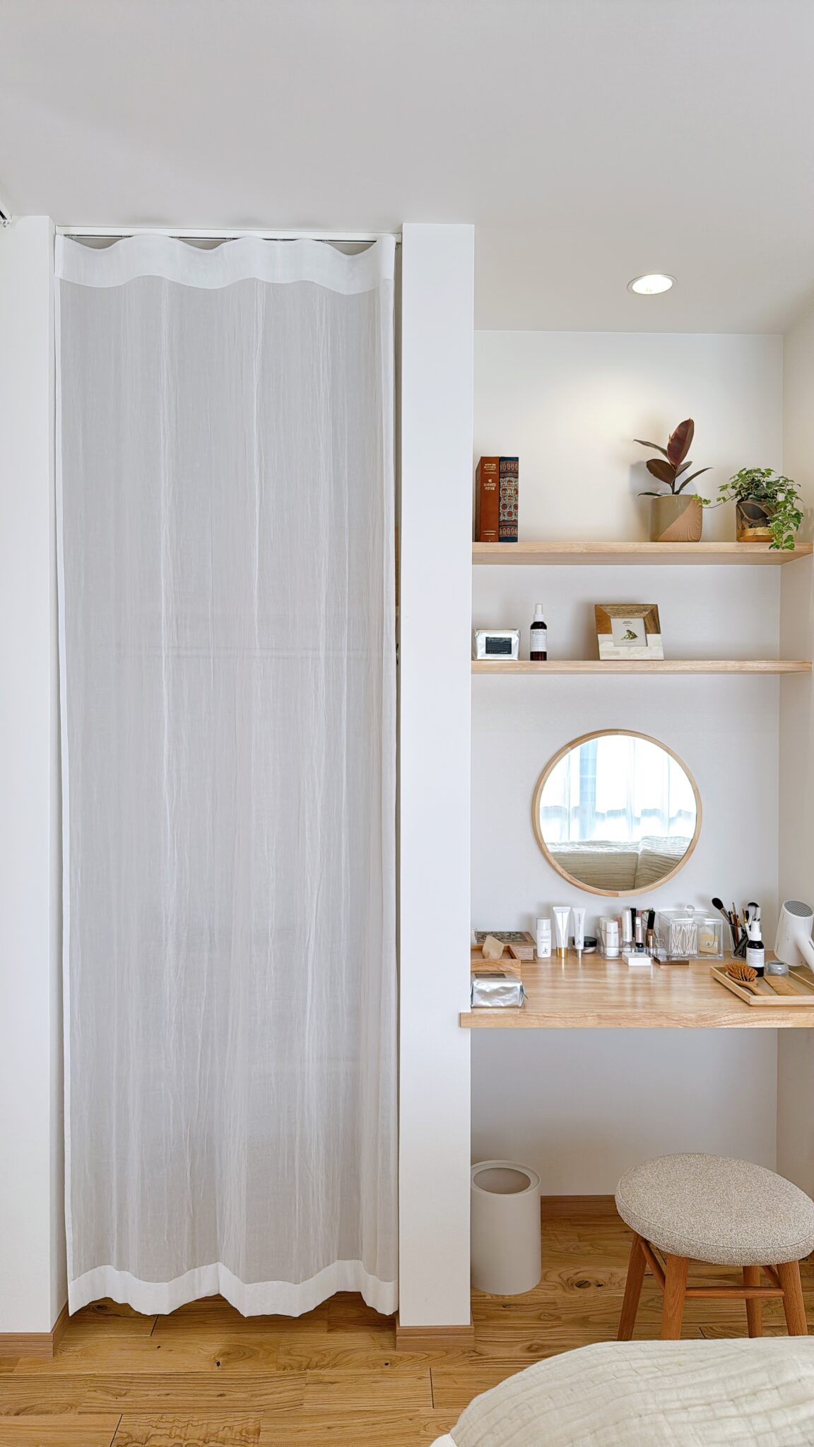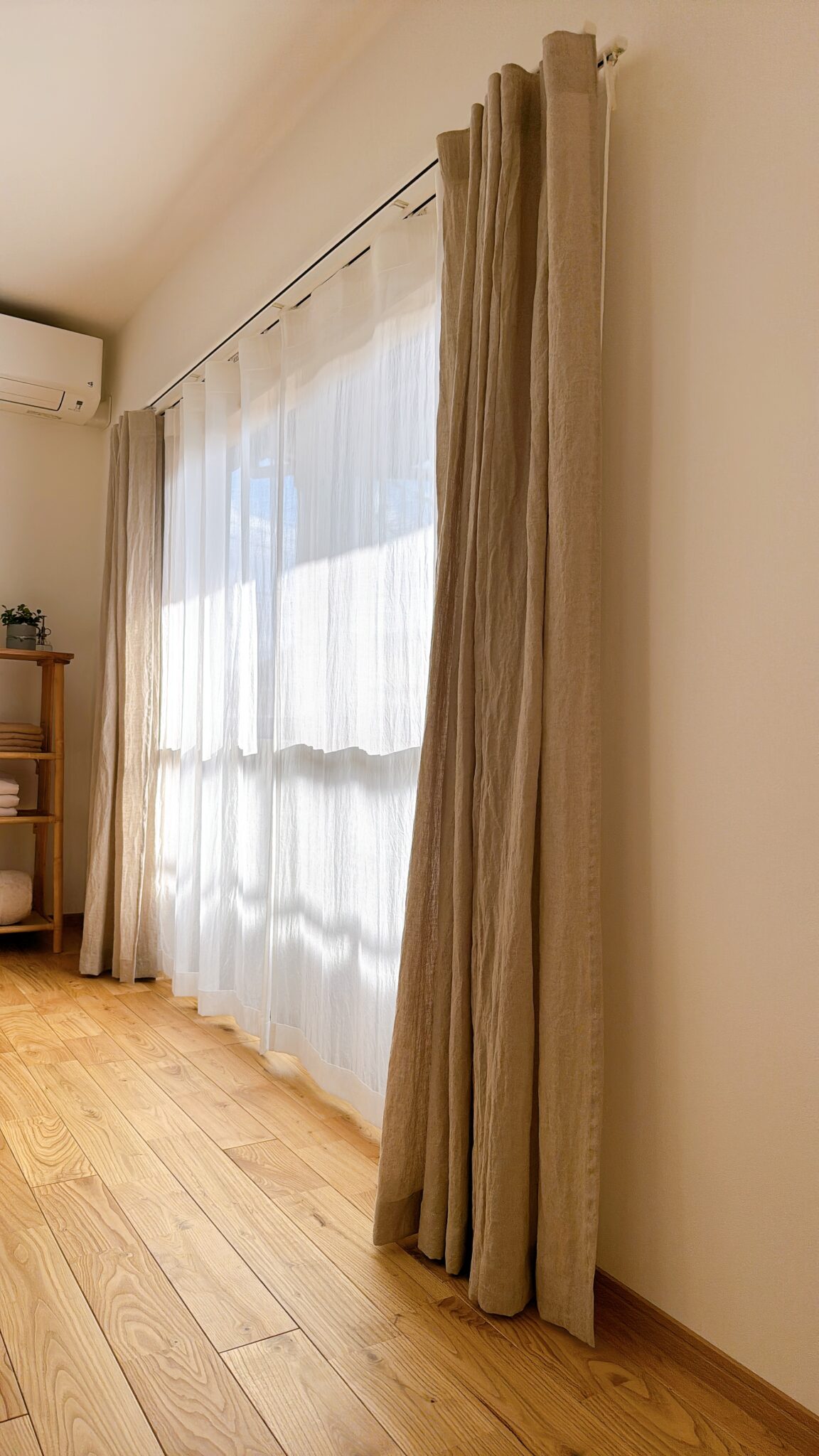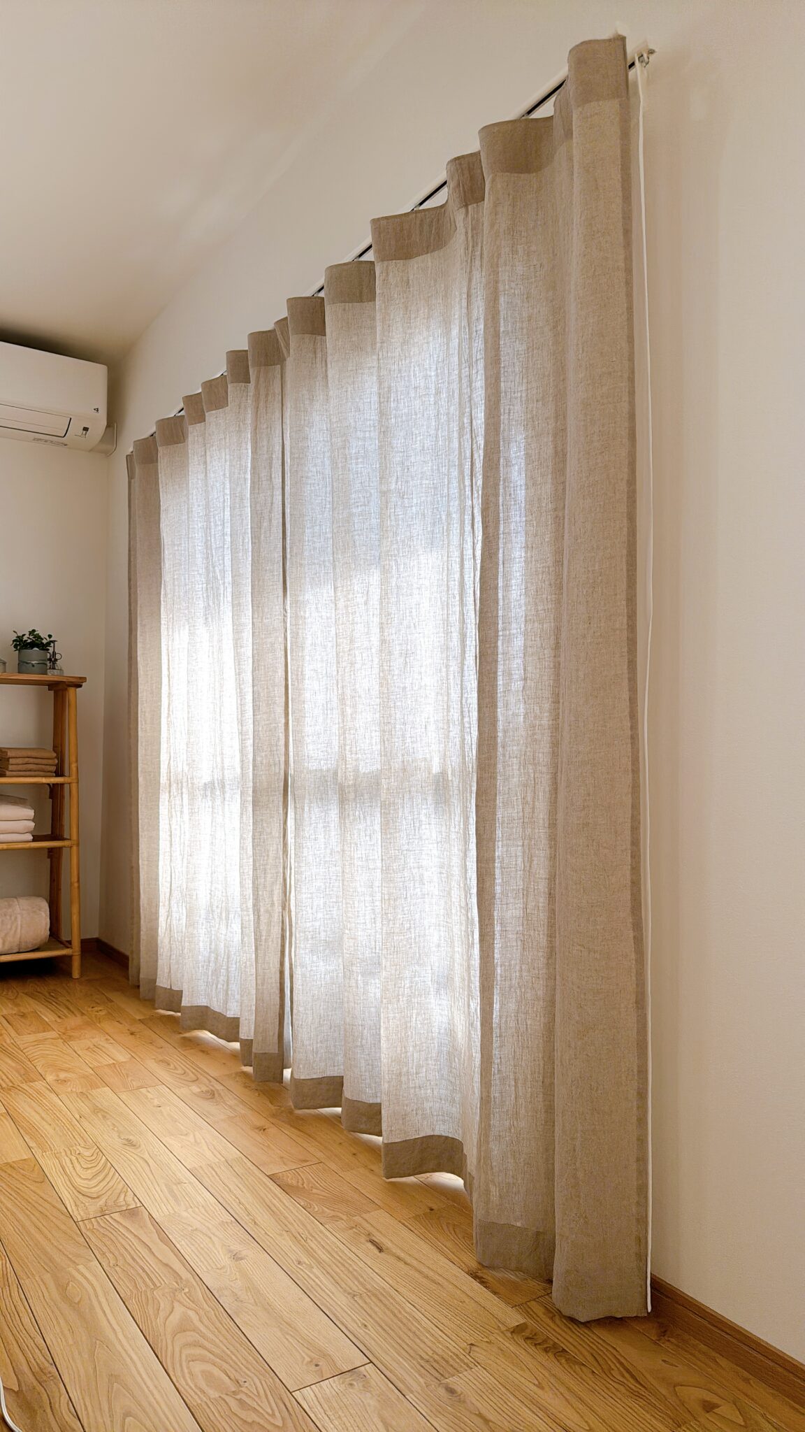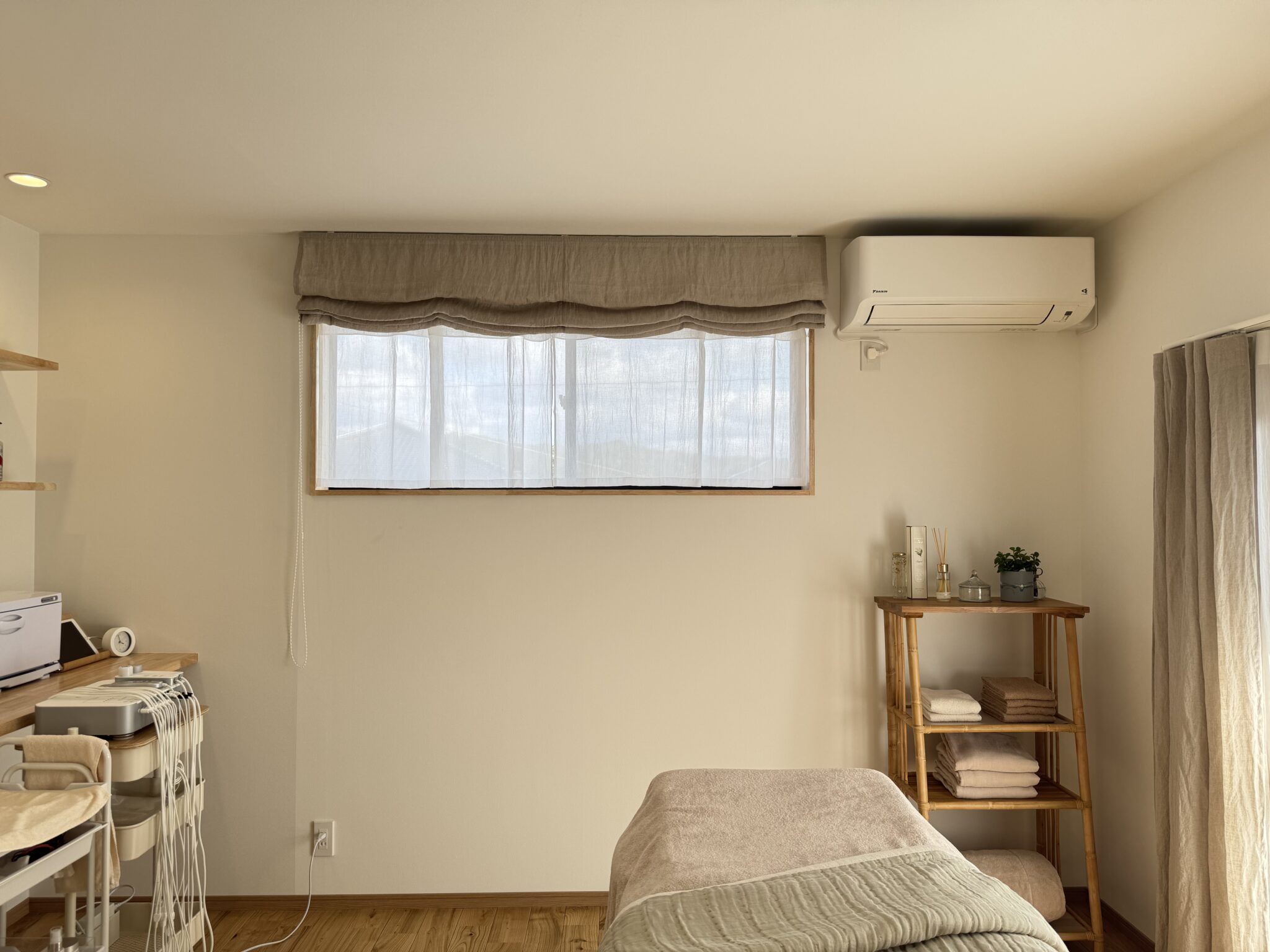 施術スペースはキナリのリネンカーテンで、ナチュラルでリラックスできる雰囲気に。