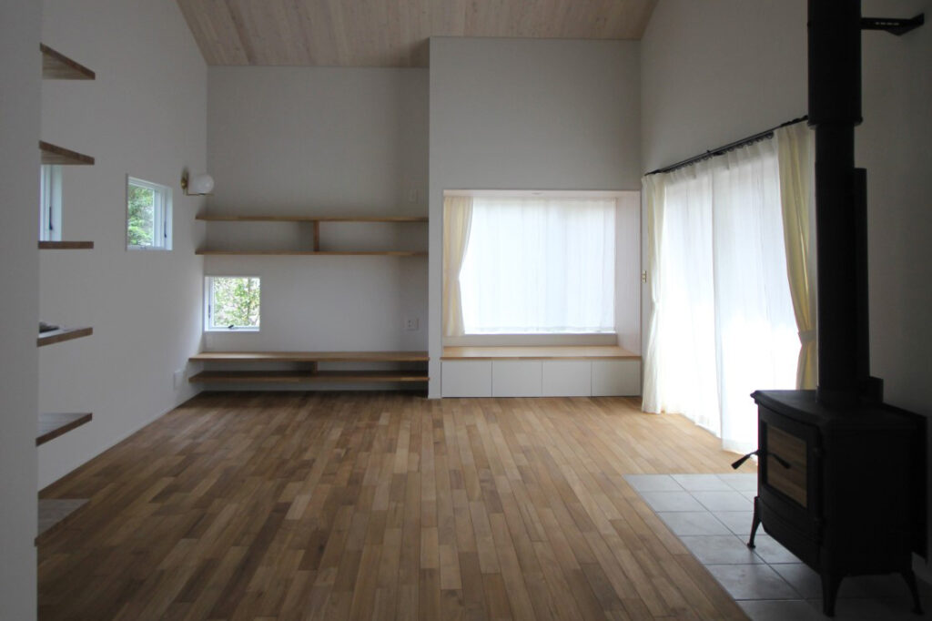 [神奈川県藤沢市] 薪ストーブのあるリビングのリネンカーテン
