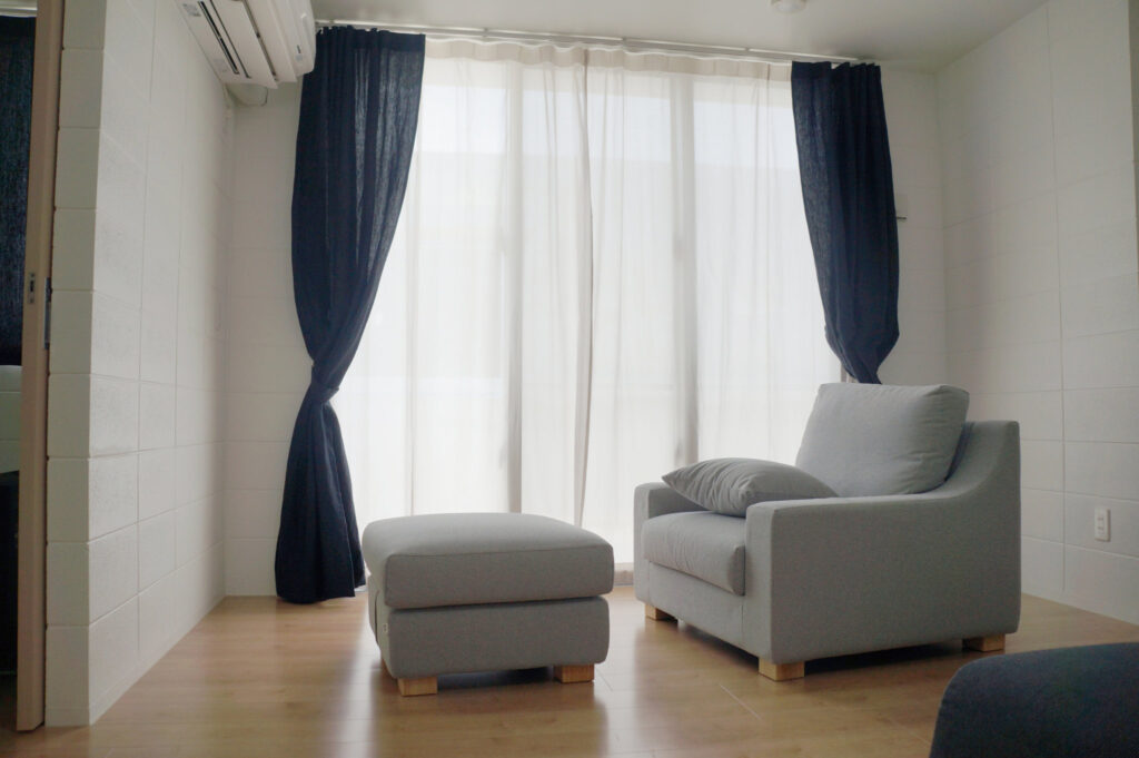 [沖縄県名護市] ネイビーのリネンカーテンとライトグレーのコットンカーテン
