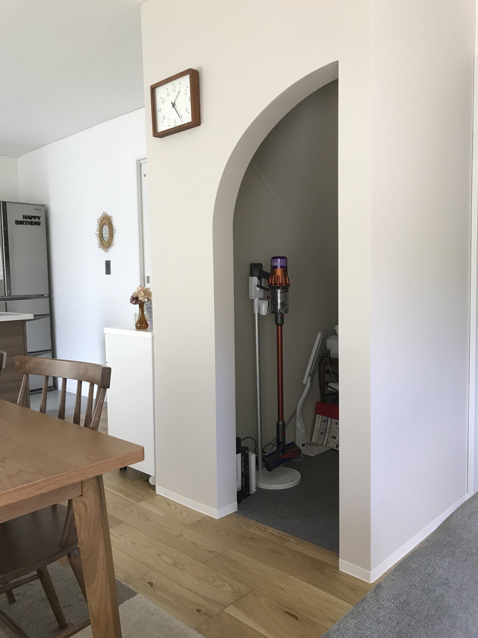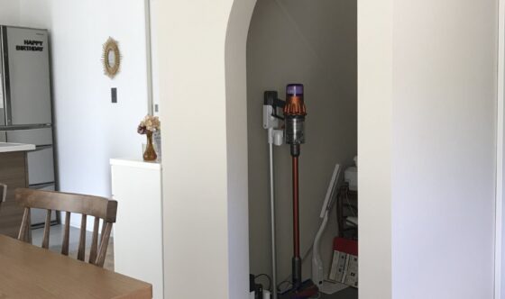 かわいいアーチのある開口部には、裏側からリネンを1枚垂らすだけで単なる目隠しではないインテリアのポイントに。