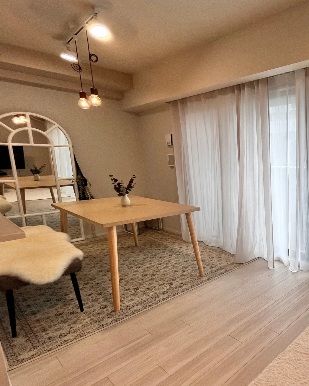 ベージュのアイテムが多いこだわり空間は、ベージュ系統のグレー色、コットンシフォンのライトグレーで仕上げることでインテリアがより洗練された印象に。