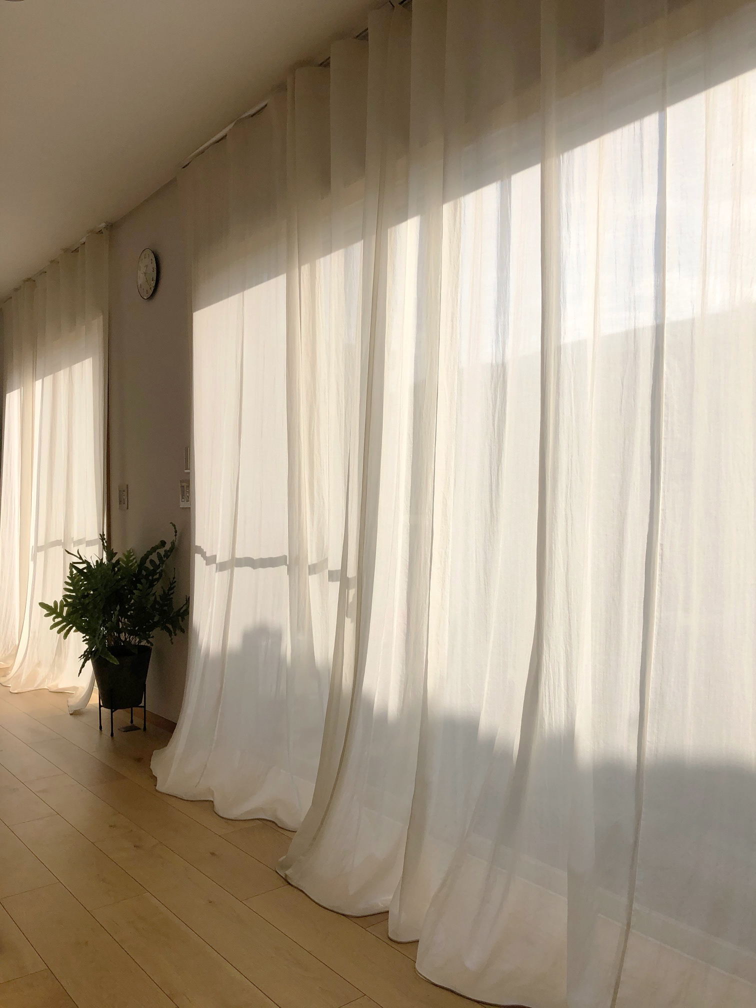 気になる事例は保存してインテリア作りにお役立てください。 お問い合せの際に、上記のコーディネートNo.を お伝えいただくとスムーズにご案内できます。 [ カーテン・Aフック ] ▫︎ 商品名:コットンシフォン ▫︎ 色:エクリュ ▫︎ スタイル:両開きフラットスタイル1.3倍 ▫︎ 丈:床+5cm ▫︎ 裾:ウエイト巻きロック仕上げ ▫︎ タッセル なし