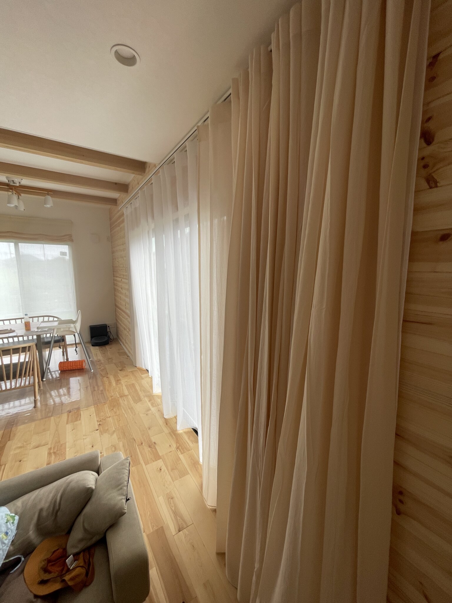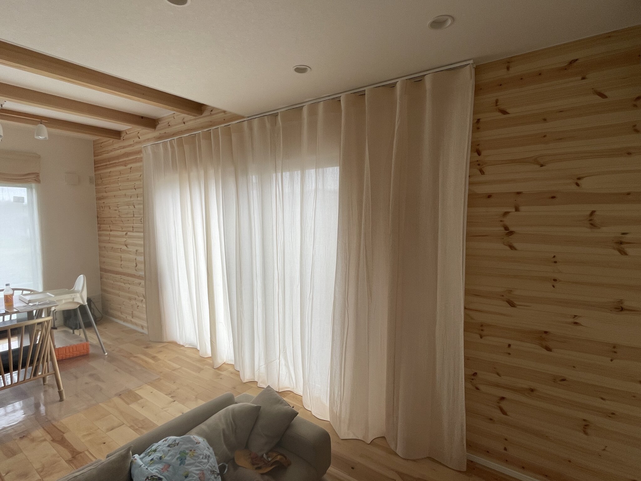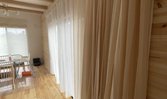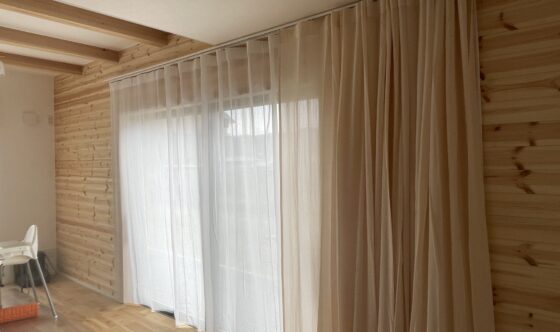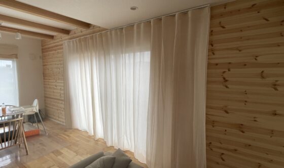 掃き出し窓を中心にカーテンレール幅を大きく取り、右に寄せたカーテン溜まりが窓にかからないように工夫しました。
