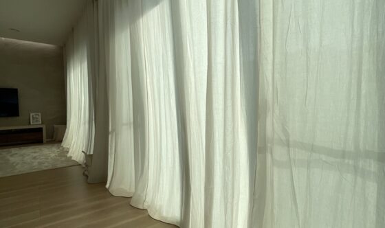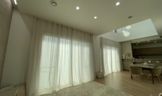 同じ壁面に並んだ窓で、片方が吹き抜けになっている場合、天井のある側を天井付けレールにして、