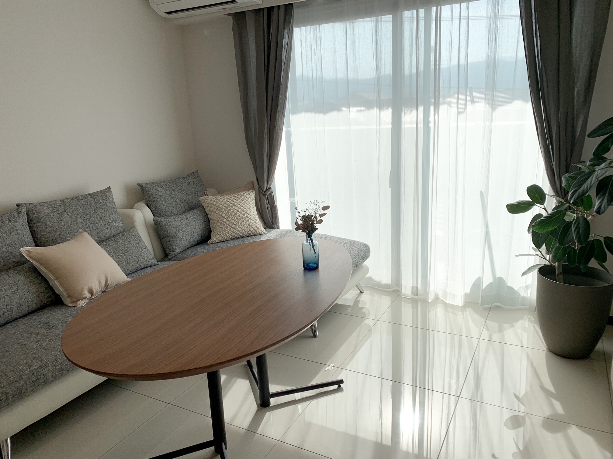 陽の光が,コットンシフォンのカーテン越しに差し込み、白い床に美しく反射し,光や影もインテリアの一部として取り込んでくれます。