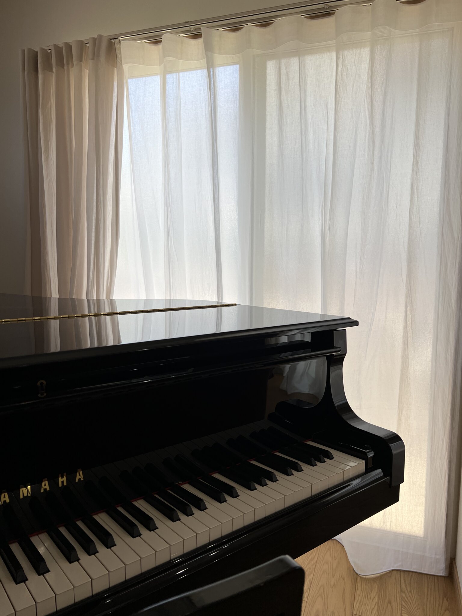 グランドピアノのある書斎には、あえて重厚なカーテンではなく、やさしい雰囲気のコットンシフォンを選びました。