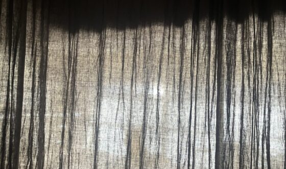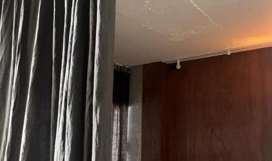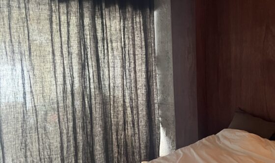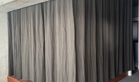 無骨なコンクリートの梁と、リネンの素材感が相性抜群です。