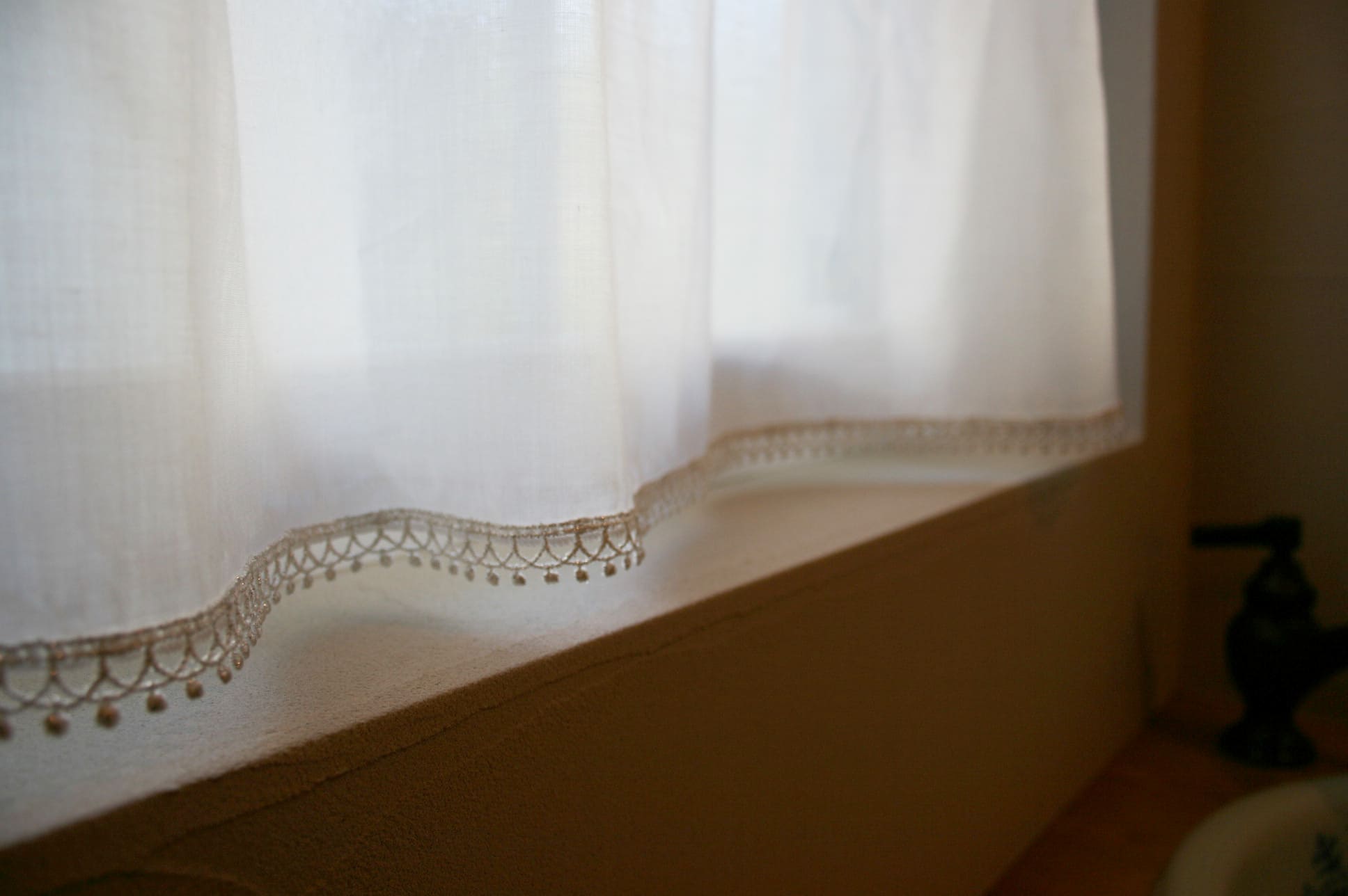 素朴な自然素材のカーテンに、ほんの少し贅沢さと女性らしい雰囲気が加わります。