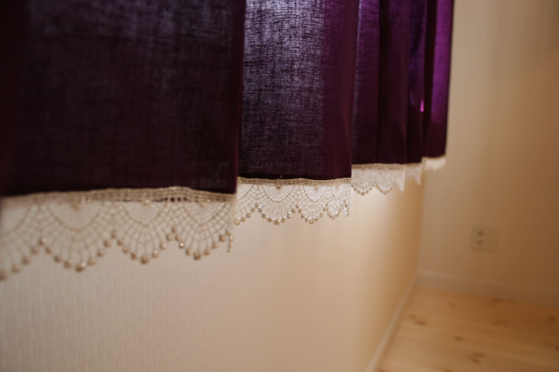 カーテンの裾に緻密な模様のトリムレースをあしらうと、