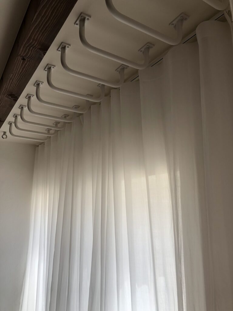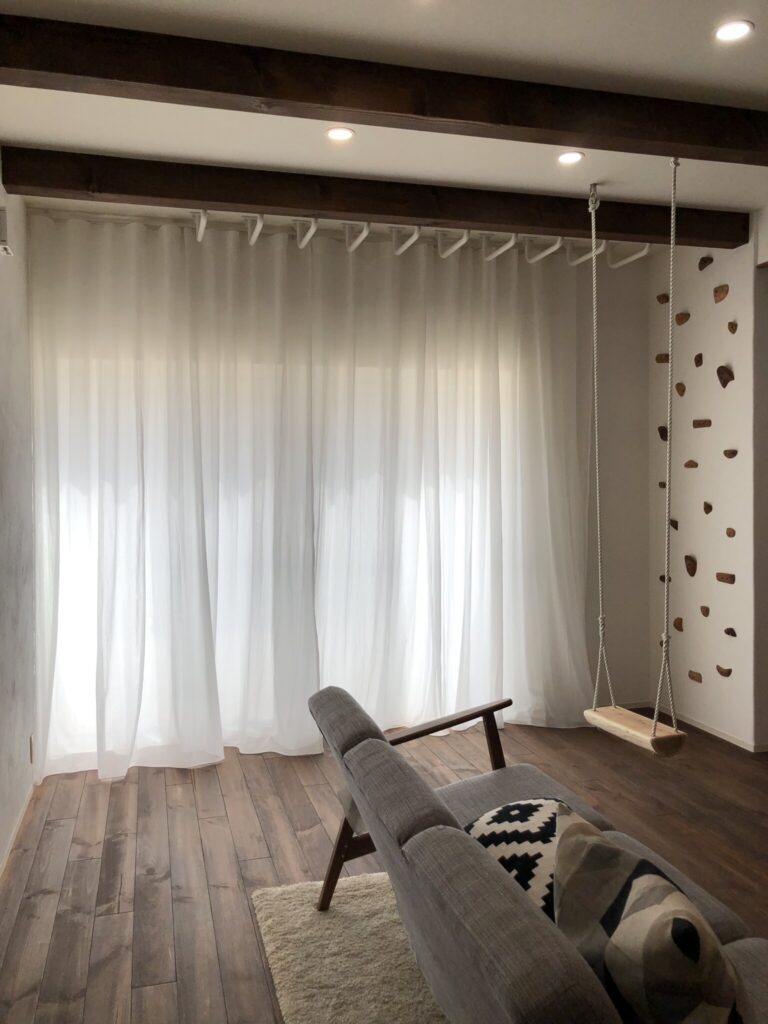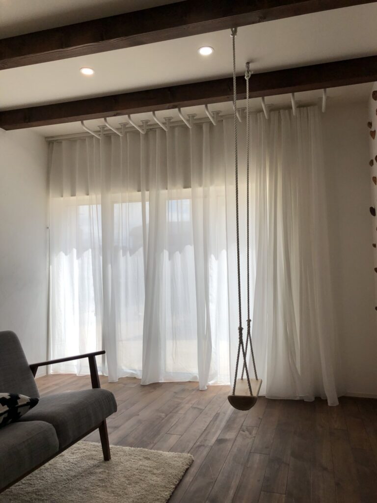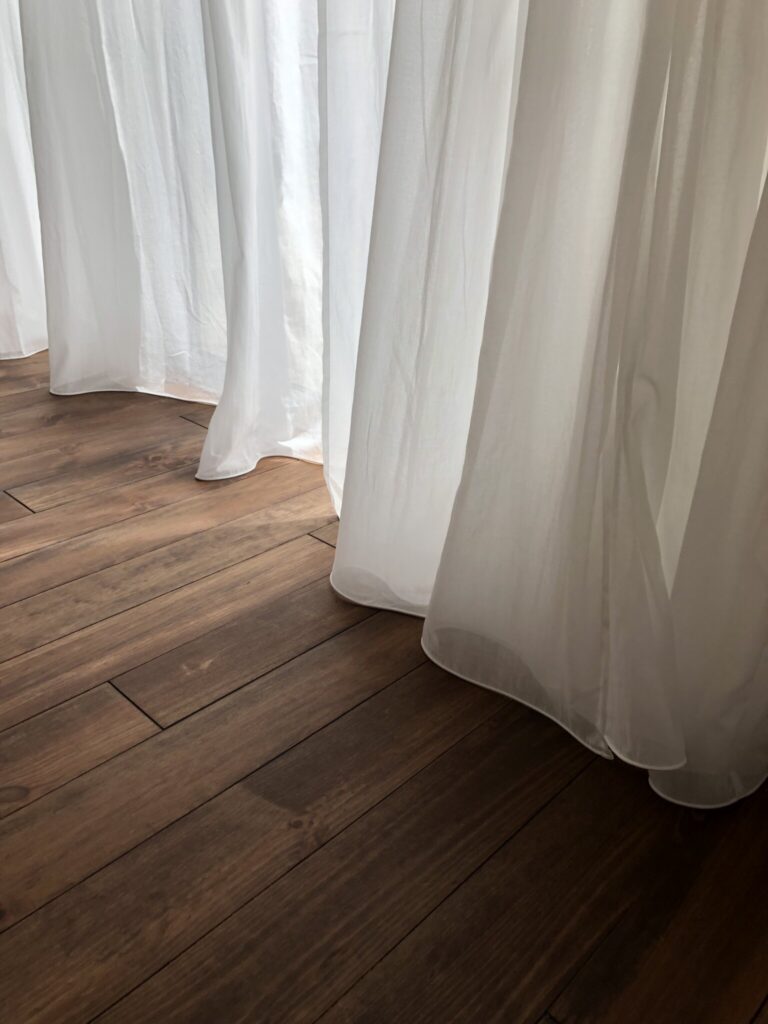 カーテンを完全に閉めた状態でも大きく波打ち、たっぷりの生地感が素敵です。