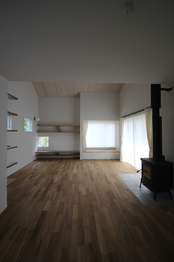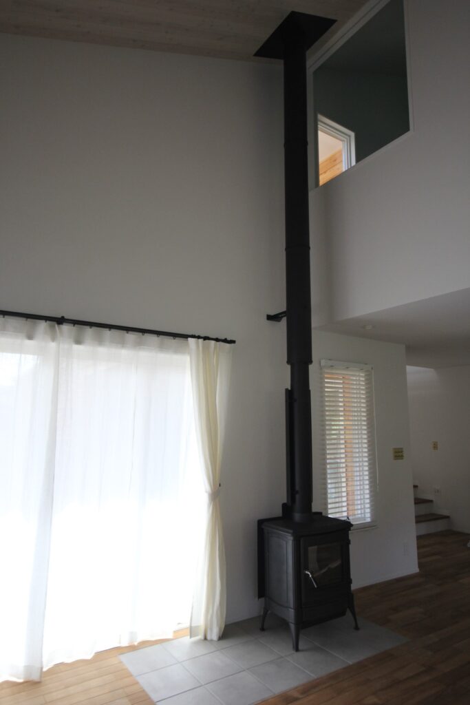 明るく光が差し込む薪ストーブのあるリビングに、オフホワイトのリネンカーテンをお選びいただきました。