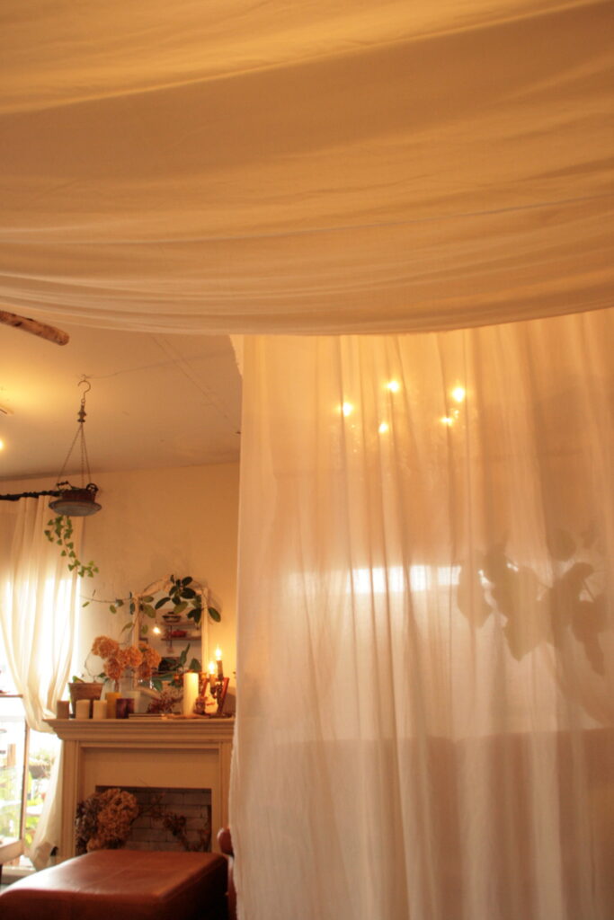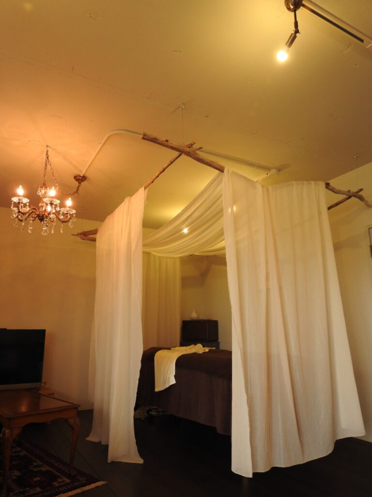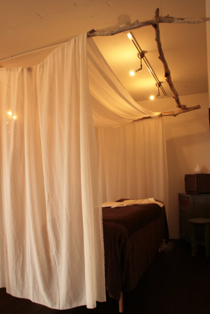 自宅リビングの一角のため、施術スペースをどのように仕切るかを考えた結果、天井から流木のフレームを吊って、そこから布を垂らす、という方法をとりました。