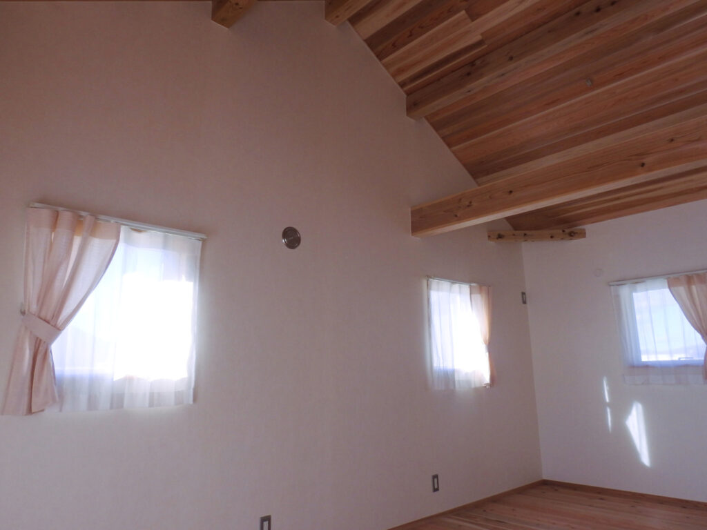 梁あらわしの内装で無垢の木の香りがする自然素材のお家にリネンとコットンのカーテンを納品いたしました。