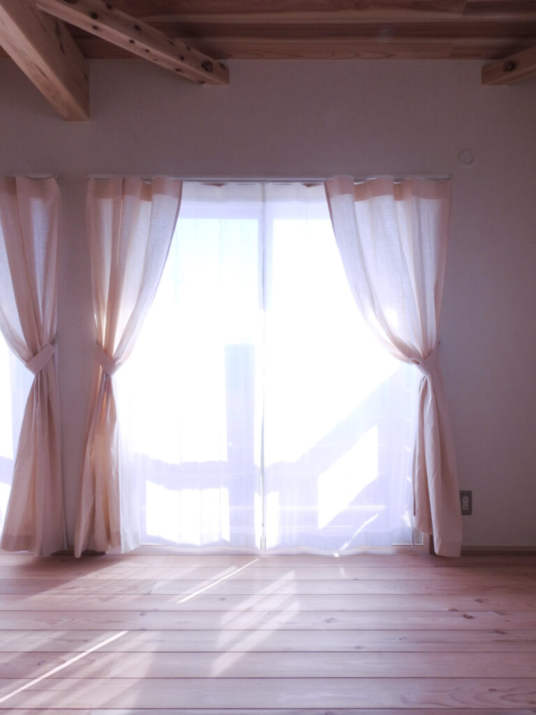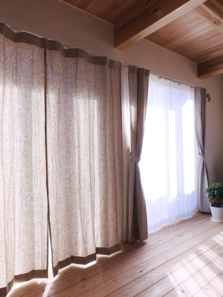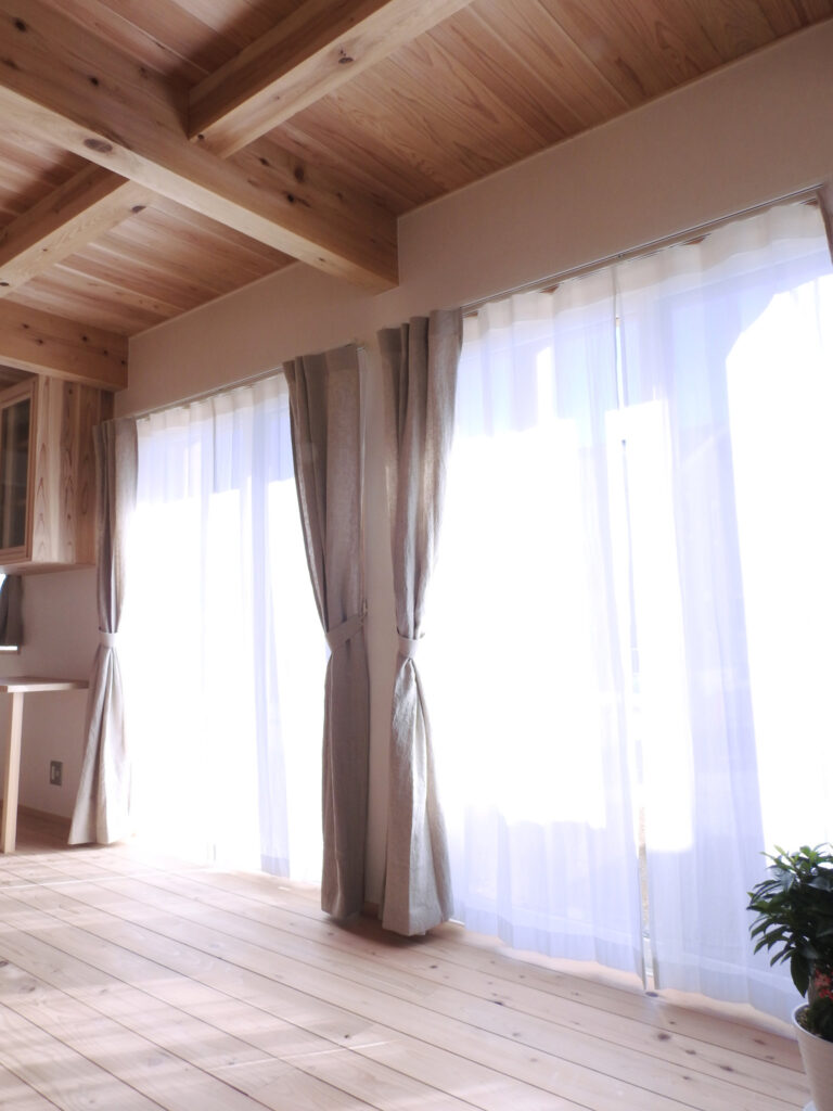 梁あらわしの内装で無垢の木の香りがする自然素材のお家にリネンとコットンのカーテンを納品いたしました。