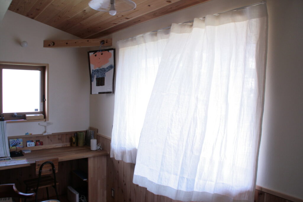 やはり漆喰や無垢の杉材などをふんだんに使った自然素材の家には、自然素材のリネンカーテンがとてもよく似合います。