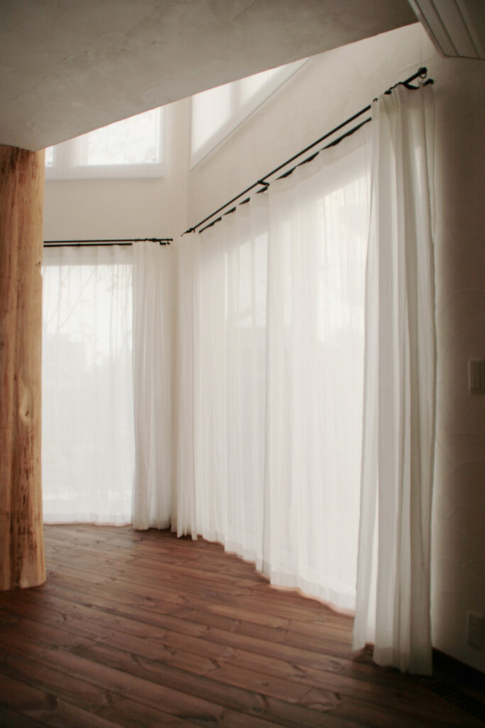 せっかくの大きな窓ですから、外からの視線を遮りながらも、たっぷりと光を取り入れてくれるコットンシフォンがベストチョイスでした。