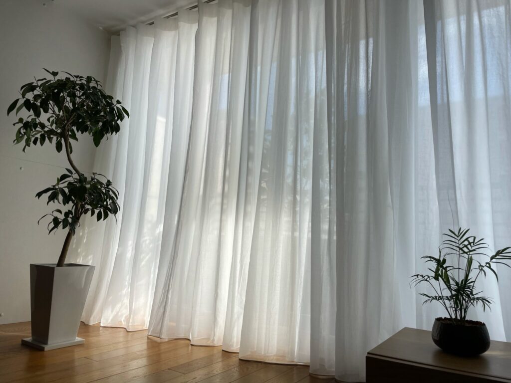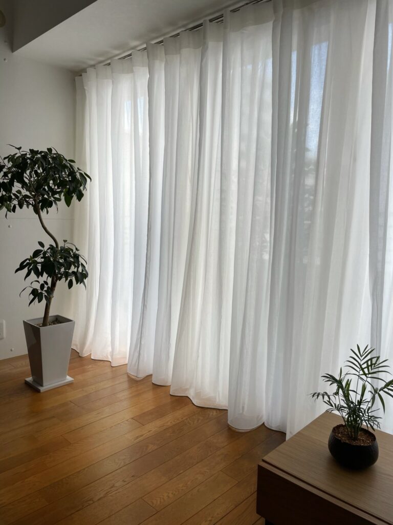 気になる事例は保存して インテリア作りにお役立てください。 お問い合せの際に、上記のコーディネートNo.を お伝えいただくとスムーズにご案内できます。 [ カーテン・Aフック ] ▫︎ 商品名:コットンシフォン ▫︎ 色:オフホワイト ▫︎ スタイル:両開きフラットスタイル1.5倍 ▫︎ 丈:床±0cm ▫︎ 裾:ウエイト巻きロック仕上げ ▫︎ タッセル なし