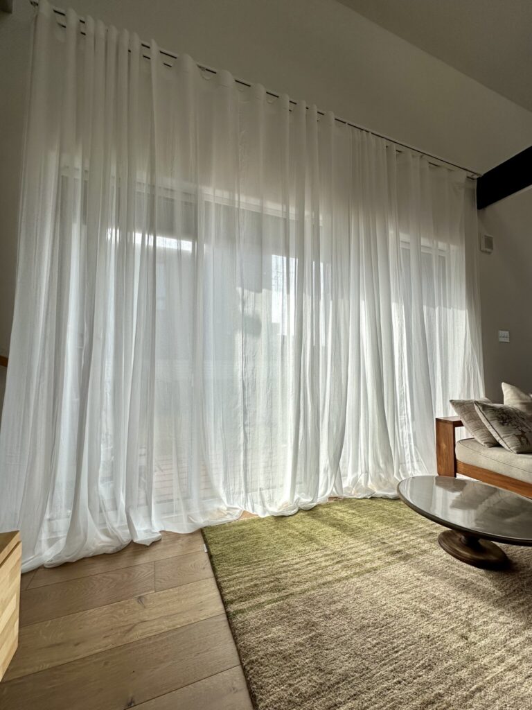 ラグに広がる不規則な縞模様の影が、カーテンのフィルター越しに朝の訪れを教えてくれます。