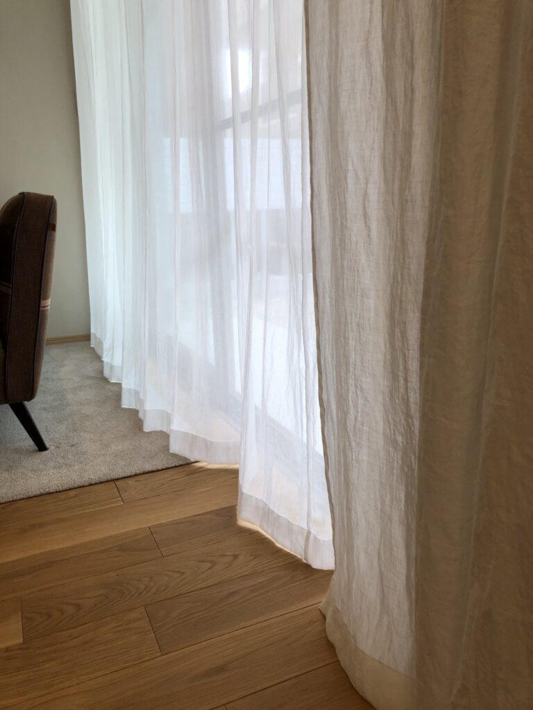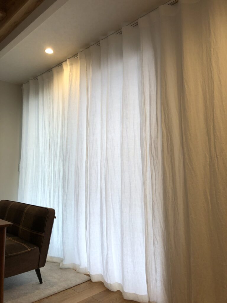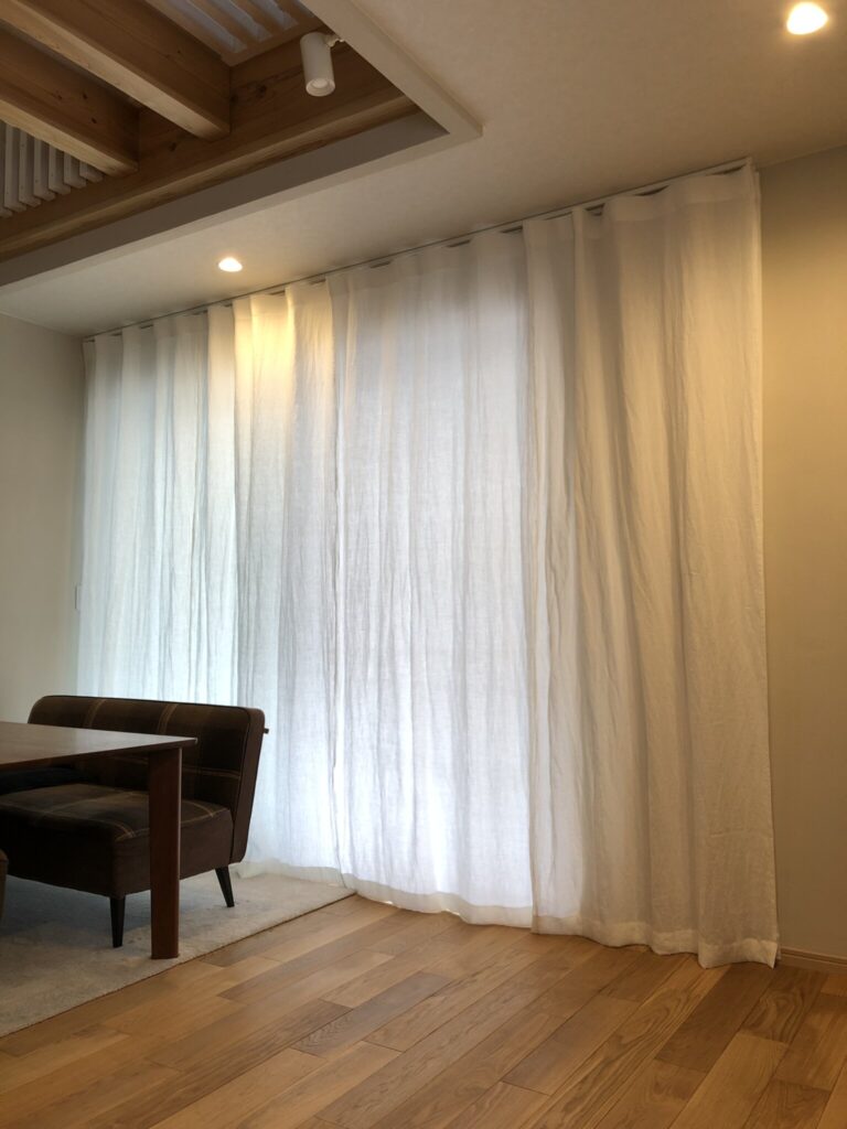 レールを右に長く伸ばして、寄せたカーテンが窓に被らないようにしています。