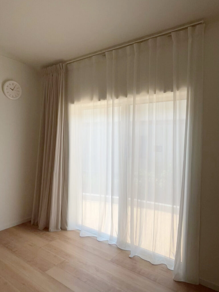 カーテンレールを窓のすぐ上でなく、天井付けすることにより、窓が大きく見え、