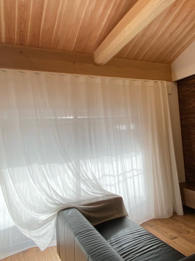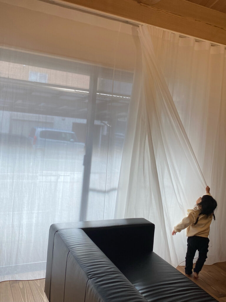 100%天然素材のカーテンはチクチクと肌を刺激することもなく、子どもがカーテンに包まる姿も安心して見守ることができます。