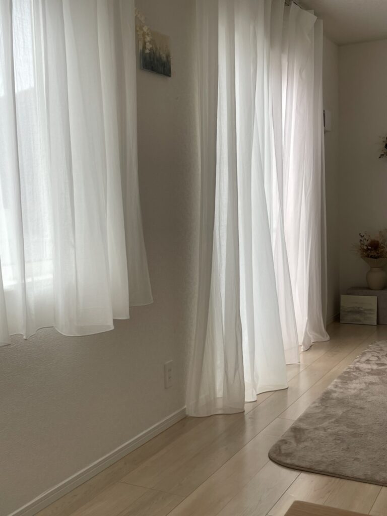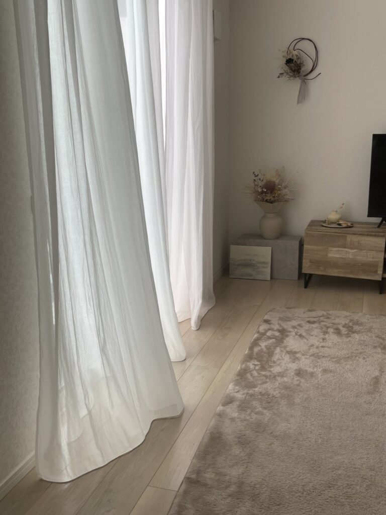 ベージュを基調としたインテリアにコットンシフォンのオフホワイト2枚使い。