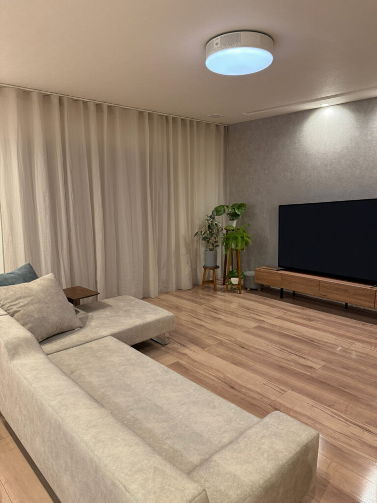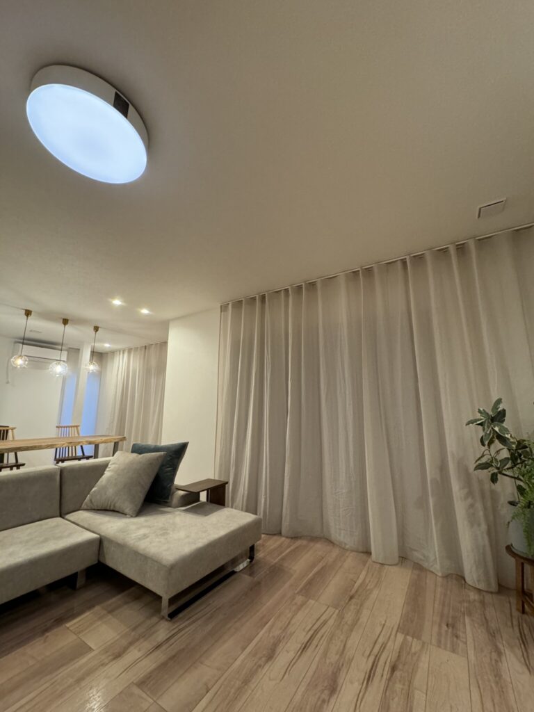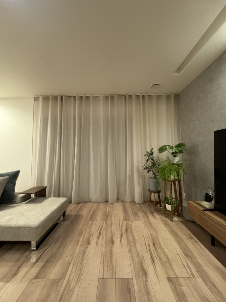 コットンシフォン・ライトグレーは、たっぷり光を受けるとベージュ系の印象が強いですが、夜の表情はシックで温かみのあるグレーへと変化します。