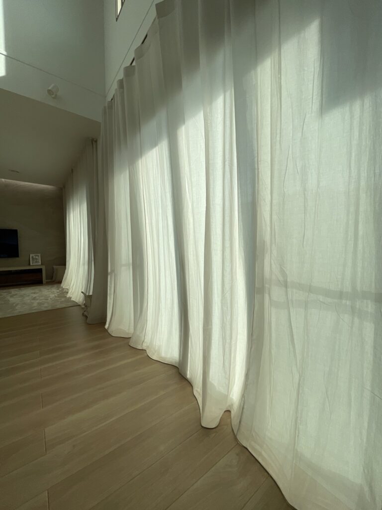 同じ壁面に並んだ窓で、片方が吹き抜けになっている場合、天井のある側を天井付けレールにして、