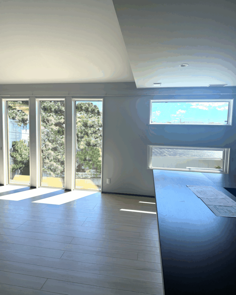 窓の向こうに広がる美しい空と景色。