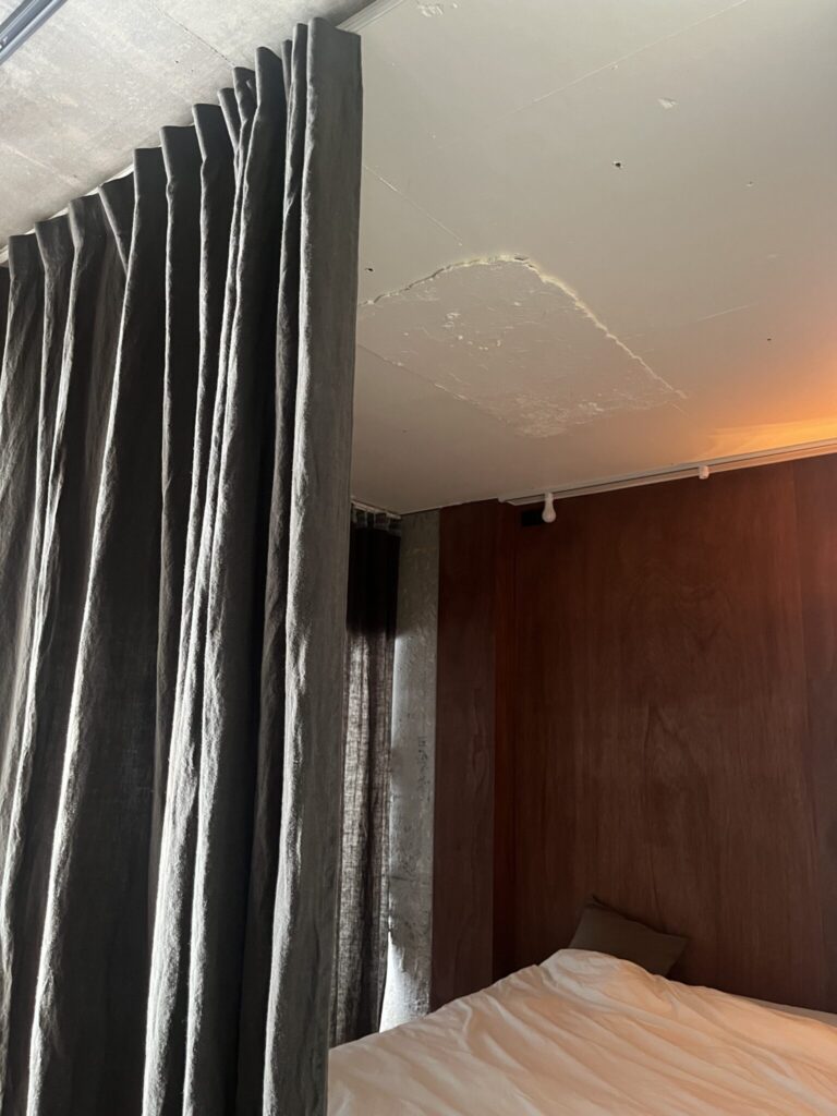 無骨なコンクリートの梁と、リネンの素材感が相性抜群です。