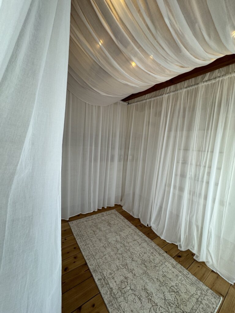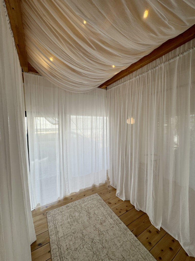 施術スペース天井も天幕で覆い、仰向けになったときに照明が眩しくなく、